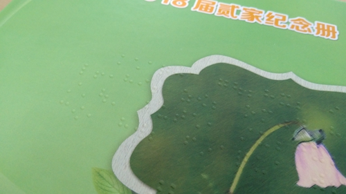 一個(gè)架子上,放著一疊厚實(shí)的精裝冊子,封面寫著“2018屆貳家紀(jì)念冊”。翻開冊子,與以往見到的一樣,紙面印著一張張燦爛而純真的笑臉和一些文字,不一樣的是,紙面上還多了一些微微凸起圓點(diǎn),大約厚度1mm左右,按一種特有的規(guī)律排列,看起來晶瑩剔透,用手撫摸一下,顆粒感很真實(shí),這就是“盲文畢業(yè)紀(jì)念冊”。